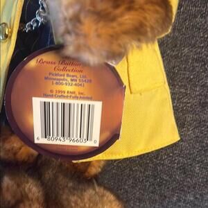 Adorable Pickford Bear Ltd. collectible 1930’s style brass button bear teddy bear dressed in a bright yellow raincoat and hat. Jointed arms and legs. New with tags.