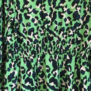 Very good preowned condition long, flowing midi Darsy dress with coquettish fit and buttons down the chest featuring an all over leopard print in bold greens, blue, white and black by Pieces. There is ruching on the back for a flattering fit and enough fabric for flow. This is an older piece and is in great shape for its age. Awesome!
