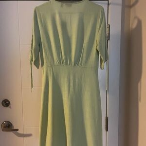 Slight a-line flare, above knee, button down, sleeves with ties on ends