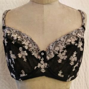 Embroidered flowers and lace cover the front and carry to the straps and sides. Sheer cup and back. Underwire and double clasp closure. EUC