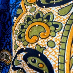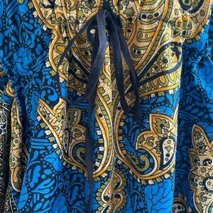A striking paisley tunic in rich blue and gold tones, finished with shimmering gold-tone embellishments sewn directly into the fabric. The adjustable waist tie allows for either a relaxed or more sculpted fit, while side seams provide full coverage. With its flowing shape and ornate detail, the piece channels effortless Mediterranean glamour — bold, breezy, and sun-ready.