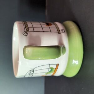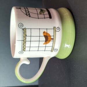Pier 1 Hand painted Stoneware Green/White Coffee Mug with Birds in Cages Design.