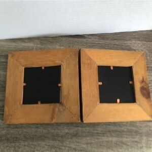 Enhance your home decor with this set of rustic wooden photo frames. Perfect for adding a touch of warmth to any room. Hinged in the middle. Rustic barn board look with metallic hinges. Each side holds a 3” x 3” photo.