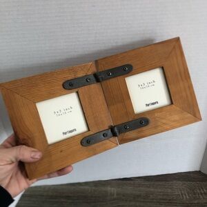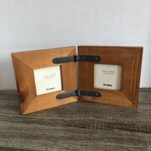 Enhance your home decor with this set of rustic wooden photo frames. Perfect for adding a touch of warmth to any room. Hinged in the middle. Rustic barn board look with metallic hinges. Each side holds a 3” x 3” photo.