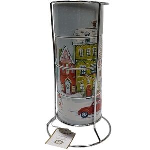 Stoneware stacking mugs with a cherry Christmas Winter Village scene Metal Rack included Dishwasher Microwave safe