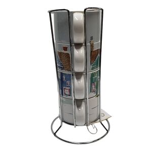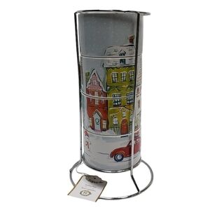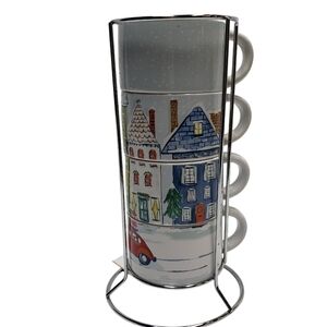 Stoneware stacking mugs with a cherry Christmas Winter Village scene Metal Rack included Dishwasher Microwave safe