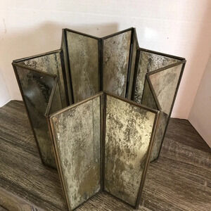 Six sided star glass hurricane lantern candle holder. Made to look like mercury glass. Holds a pillar candle up to 3” x 9”.