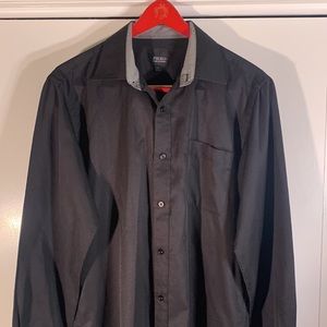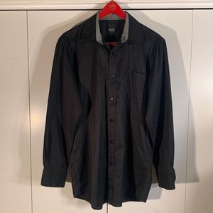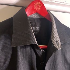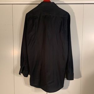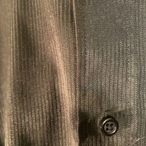 Even though this could be looked at as being just another black shirt it’s got a few little things going for it that make it special. The fabric is a cotton poly blend, which gives it a little bit of a sheen and allows it to drape over the torso in a very flattering manner. This lightweight fabric really flows in moves while being worn. It has a really subtle pattern that I’ve tried to capture in the photos and I hope that you can pick up on it. It’s Italian heritage means that it’s cut and tailored in a manner that has a slimming effect on the wearer. This is a very nice shirt. Regarding its condition I can find no flaws on it whatsoever. I’m fastidious about condition and this item can be purchased and worn with complete confidence. Thanks a lot for looking.