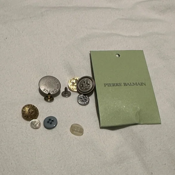 Set of assorted designer buttons including Burberry and Jacadi with a Pierre Balmain card. Includes gold, silver, and blue buttons.