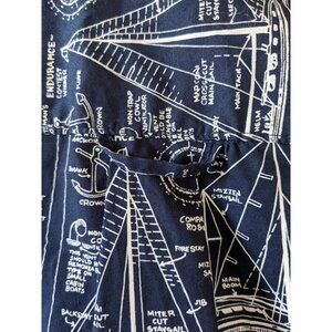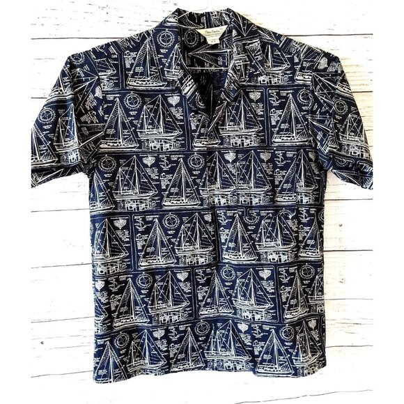 Description : button up , spread collar, short sleeves, chest pocket , nautical print all over .