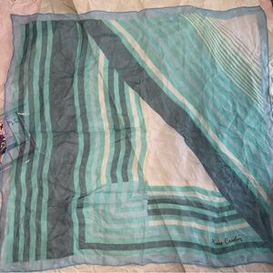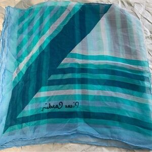 Elegant striped scarf by Pierre Cardin. Features blue, green, and gray stripes.