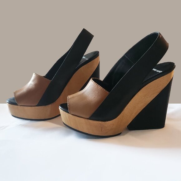 Stylish wedge heels by Pierre Hardy. Black and brown leather design. Modern slingback feature. Fits narrow and size is more like a 5.5.