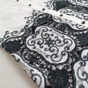 A unique button down cover-up top in a soft white tone. It has intricate black lace crochet and patchwork detail on the front and back. It’s made from delicate, lightweight cotton with no stretch and the upper half has a semi-sheer finish. Perfect for summer. New with tags. Great condition.