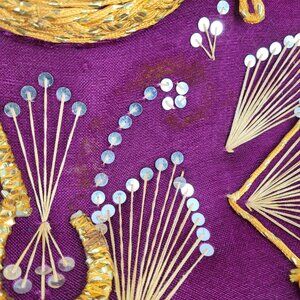 Vintage sombrero looks to be from around the 1970s, it is old! Made with a thick outer velour material (not like the cheap material that later ones were made with). This hat is by no means perfect, it does have a few missing "hook" decorations on the top, has worn areas, small stained spots and may have the odd broken string or missing sequence decoration. Does not state size anywhere but measures 6.5" across the head opening on the short side (side to side) and 7.75" across the long side (front to back). Sold as is and comes as shown in the photos. Color on the first pic looks red due to the flash but it is more purple in color.