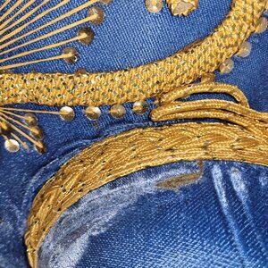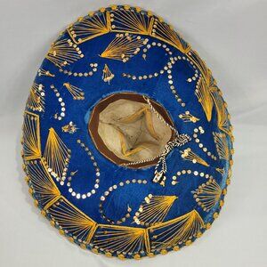 Vintage sombrero looks to be from around the 70s, it is old! Made with a thick outer velour material (not like the cheap material that later ones were made with). This hat is by no means perfect, it does have a missing interior liner, has worn areas, small stained spots and may have the odd broken string or missing sequence decoration. Does not state size anywhere but measures 6.5" across the head opening on the short side (side to side) and 7.75" across the long side (front to back). Sold as is and comes as shown in the photos.