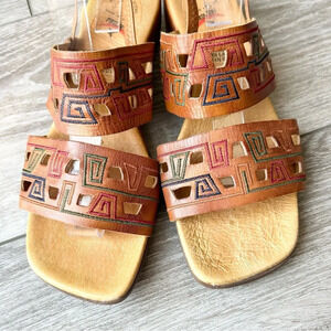 Pikolinos Brown Tan Leather Embroidered Square Toe Slingback Sandals