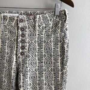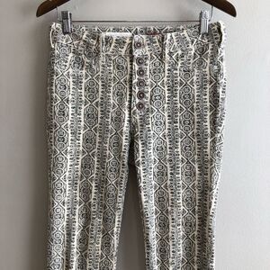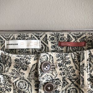 Pilcro and the Letterpress / Anthropologie bohemian boho style soft corduroy high rise waist skinny leg fit printed jeggings jeans pants. Cream in colour with black pattern throughout. Soft with light stretch. Size 27. Approximate measurements | waist: 27“ length: 36” inseam: 27“ rise: 9.5“ Great gently pre loved condition. Fabric and care tag are pictured. Offers welcome!