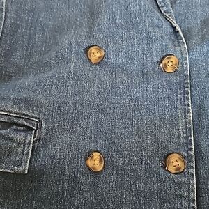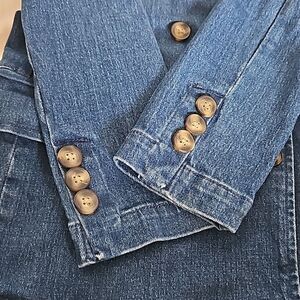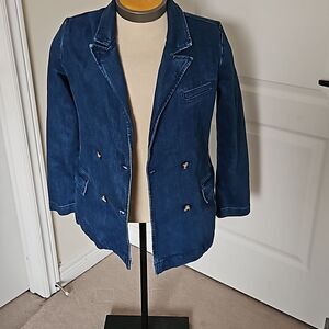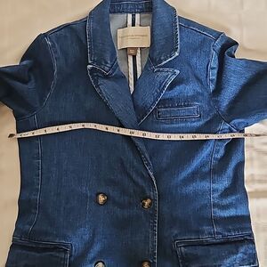 The Pilcro Blue Blazer offers a sophisticated blend of classic blazer style with the casual charm of denim. Its medium-dark blue hue and structured silhouette make it a versatile piece for both formal and casual settings.