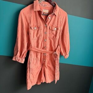 Stylish coral romper by Pilcro. Features button-up front and belted waist. Perfect for casual outings.