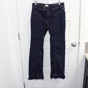 Stylish boot cut jeans. Dark blue color. Frayed hem detail. Perfect for casual wear.