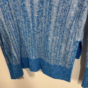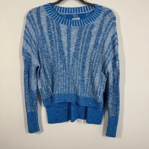 Extra keywords: Pilcro sweater, Anthropologie sweater, blue ribbed knit top, high-low hem sweater, marled knit crewneck, XXS lightweight sweater, spring layering sweater, cozy casual knit, two-tone blue sweater, textured knit pullover, fall, fall outfit,