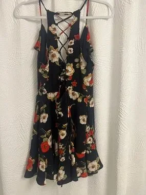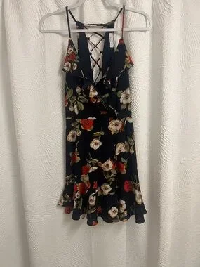 Sleeveless mini dress with adjustable spaghetti straps. Lace-up back detail adds a flirty touch. Ruffle trim along neckline and hem. Bold floral print for a feminine look.