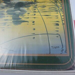 RARE FIND! Set of 6 Pimpernel coasters featuring artwork by Canadian artist Don Di-Leger (his signature appears on the bottom right of each coaster). These are unused, unopened, and factory-sealed in their original box. The image is a bit difficult to photograph because of glare from packaging, but it is quite beautiful - a tranquil scene of a pair of loons near the shore of a lake at twilight (or dawn?)