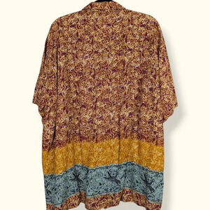 This contemporary shirt by Pineapple Connection is made of 100% rayon and features a sort of wild, squiggly, abstract pattern in red, yellow, and blue. The shirt has a button-down front, a single front pocket, and short sleeves.