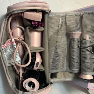 Versatile air styling and drying set in pink. Includes multiple attachments for various styles.