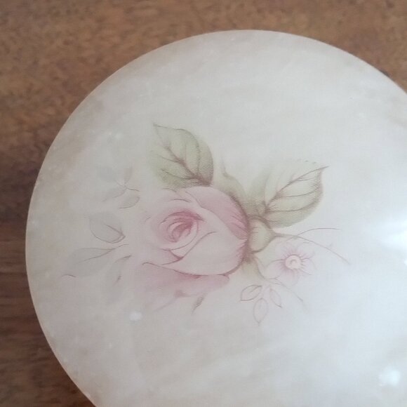Soft pink hinged vintage alabaster trinket box to store small items.