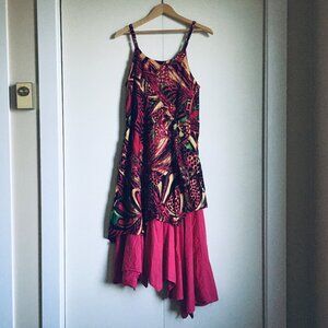 Very good preowned condition, unique, long, cotton, tiered, handkerchief hem dress by Leopards & Roses. This is such a cool dress with its patchwork, embroidery, and batik inspired print in black, hot pink, green and yellow. The bottom layer is hot pink with a zig-zag hem, while the top layer is an eclectic fusion of abstract leaves and botany. So cool. Love this brand and leopards are one of the shyer big cats in need of our protection. So earthy.