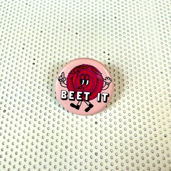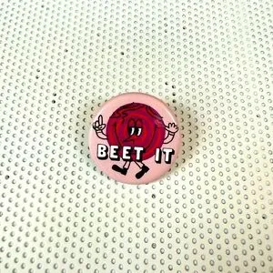 Fun pink button pin with a cute and quirky cartoon beet character with the words 'Beet It'. Perfect for adding a playful touch to your outfit. Brand new condition, measures bout 1 inch