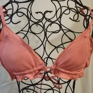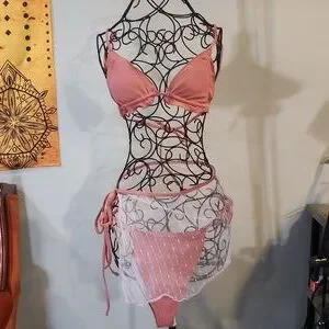 This is a warm pink, beautiful colour has a corded texture. Adjustable but top is a small/medium and bottoms are a medium/large, cover up is medium in my opinion. No size tags. No known brand.