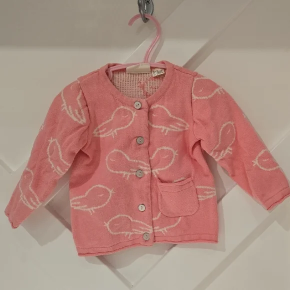 Adorable pink sweater featuring a charming bird pattern. Perfect for keeping your little one cozy and stylish.