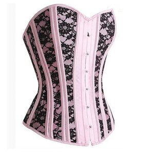 Pink Black Lace Steel Boned Corset Set - NEW