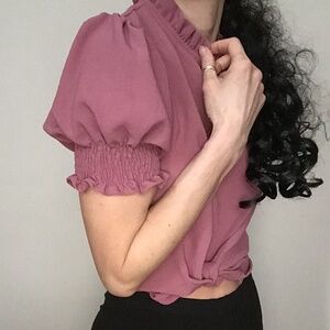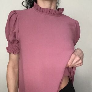 Gilli blush pink short ruffled sleeve blouse with frilly button up mock neck collar. The mock neck has 1x pink fabric bottom on back of feminine collar for closure. Fluffy cap half bell sleeves with tapered elastic ruched finishings. Wide bottom t-shirt blouse, sits below waist on 5 8” model. Easy to wash and wear, comfortable rigged textured material made of 100% polyester.