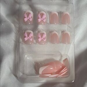 Stylish false nails with pink bow design. Perfect for a chic look.