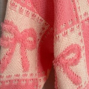 Stay cozy and stylish with this charming pink sweater featuring a delightful bow pattern. Perfect for adding a touch of elegance to your casual wardrobe.