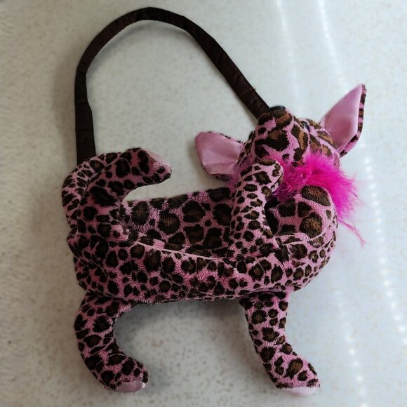 Furry Couture Pink & Brown Stuffed Chihuahua Dog Purse Pouch With Zippered Closure. For Ladies and Girls. Like new great to excellent overall preloved condition. 10 inches aprox by 11 inches aprox by 3 inches deep aprox Washed and sanitized.