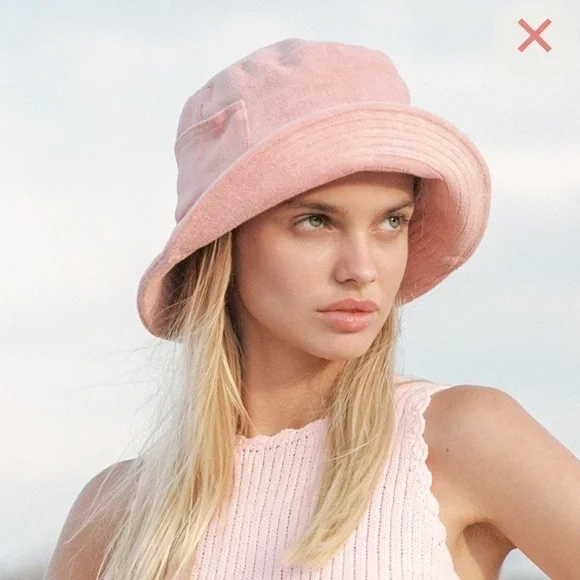 Soft pink bucket hat with a cozy texture. Perfect for casual outings.