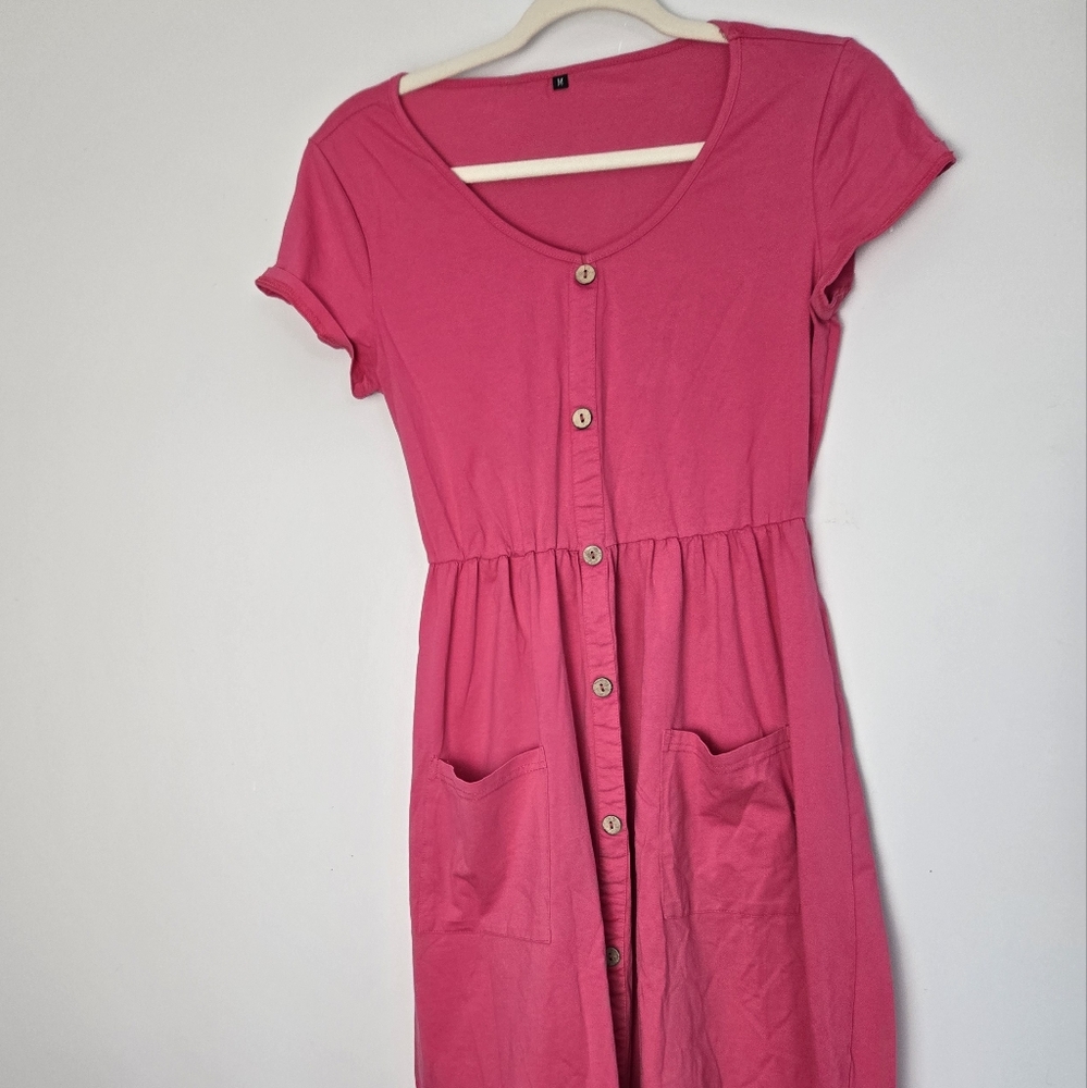 Chic pink faux button-down dress with short sleeves. Features a flattering fit and stylish buttons.