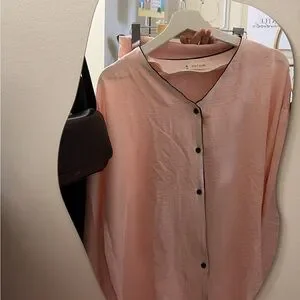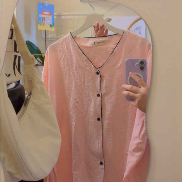 Stylish pink button-up pj set with black trim. Comfortable and soft and cozy wear.