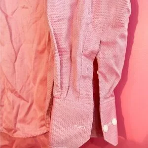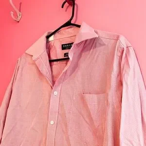 Stylish pink button-up shirt with a classic collar. Perfect for any occasion. A bit wrinkled from storage.