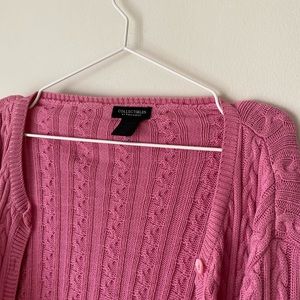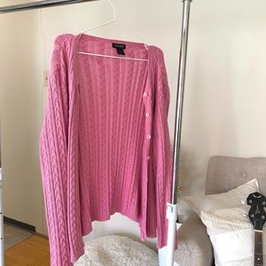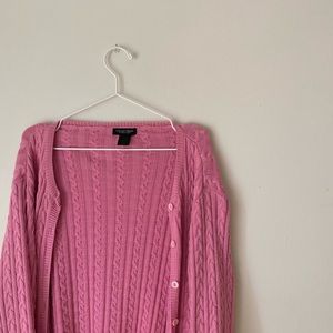 Stay cozy and stylish with this pink cable knit cardigan. Perfect for layering, this cardigan adds a pop of color to any outfit.