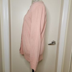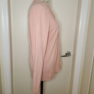 Dusty rose Pink Buttonup Crewneck Cardigan Sweater embroidered with pink poinsettia Flowers, tiny seed Beads and rectanglar Rhinestones, by Tradition from Sears.