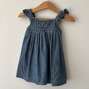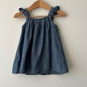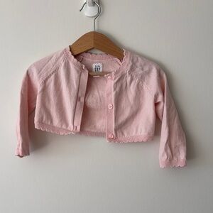Adorable pink cardigan paired with a blue dress. Perfect for any occasion.