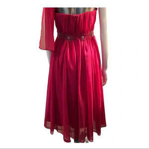 Cocktail length strapless dress with back zipper. Fully lined. Sash/Scarf included. Ruched bodice with beaded/sequinned waist detailing. Some minor pulls on the bodice, please see picture. There are some beads missing but is only noticeable upon close inspection. The labels have been removed however it is a size 4-6. Please message me for more information.
