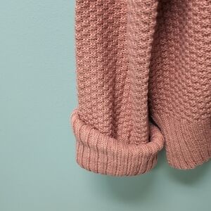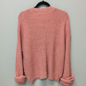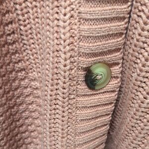 This soft dusty pink cardigan features a relaxed oversized fit and a stylish V-neck opening. The chunky textured knit pattern adds warmth and coziness, making it a perfect layering piece for cooler days.
