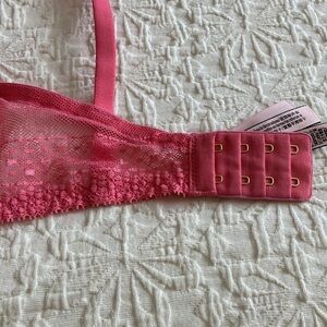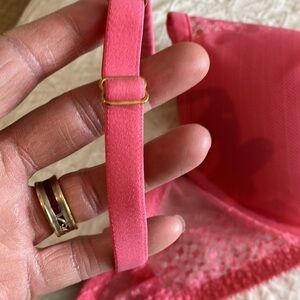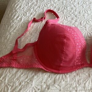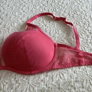 Pink Coral Victoria’s Secret 32DDD plunge bra w/light padding & lace overlay.