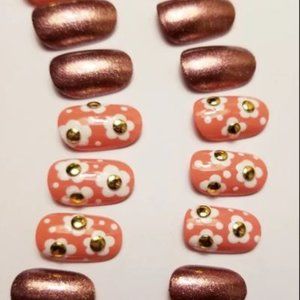 These super pretty pink and gold flower press on nails really pop! The nails are easy to apply with either nail glue or adhesive tabs (not included). Your purchase includes a gift box, a file and an orange stick. Gift box and nail file may vary from those pictured.